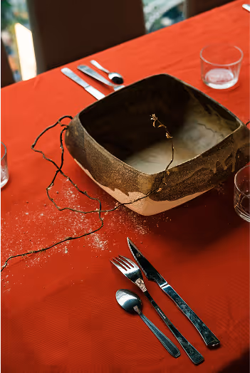 Une expérience multisensorielle basée sur la rareté :Chaque convive a été confronté à une raréfaction de l'eau — notre ressource la plus critique sous +50°C. La scénographie aride, ponctuée de céramiques remplies d'eau (des oasis imparfaits), matérialisait cette tension. À chaque louche puisée, le niveau baissait drastiquement, forçant chacun à se poser la vraie question : « Si je me ressers un verre, que restera-t-il pour mes voisins ? »